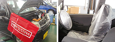 お車に配慮し、ハンドルカバーやシートカバー、足マットカバーで保護してから検査に入ります。