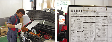 整備記録簿に基づき、ディーラー車検と同じ法定56項を点検します。外装・フロントガラス・信号用具の点検後にエンジンルームの点検を行います。